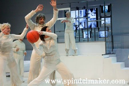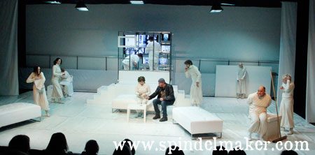 For the set we built two small stairs, used stage-elements as a base for the “office”. The two major visual features are two big metal-frames, which was especially made for another Bømlo teater production. The back frame was filled with TV screens. We borrowed a big one form a local shop, and the smaller ones I got from a marketing-firm who had a ware-house clean-up and gave them to me for free. The three big benches are already at the culture-house, but we upholstered them with white fabric. The floor was covered with white dancing-mats we borrowed from the local dance-group. Apart form the fabric for the benches, the only new investment was white fabric for the side-carpets. And long, white strands fabrics can be used again and again for several productions.