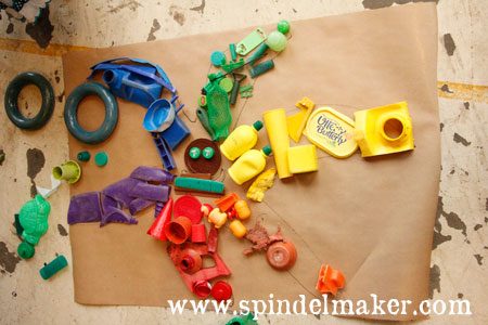 The kids also had the opportunity to make their own collages from our supply of ocean-plastics. By drawing simple shapes onto paper, the kids could lay down the colored objects as they wished, the art could be photographed and the original collage could be re-done. Here is a starfish: