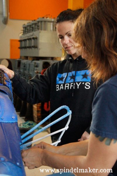 Elizabeth is instructing Larisa how to work with the fin. This one is special, as it will become transparent.