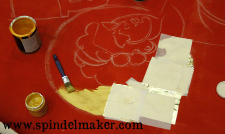 I did the halos yesterday, painted first with gold-paint, and then added the gold-leaf (or gold-colored metal-leaf to be precise)