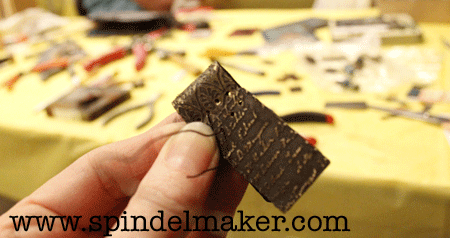A new day, and a new class. This time with the wonderful and funny Jen Crossley from Australia. This was the perfect class, so much fun stuff going on: filing, drilling, etching, adding patin, sanding, bending and stitching. Work in progress below.