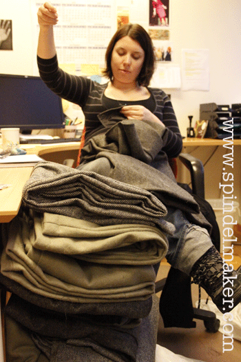 I´ve been working all day too, and thought for sure I could cross something off my list and get started on some new stuff. I altered and finished a couple of dresses and almost finished a coat. And yet it doesn´t seem so much, I wish I´d gotten a lot more done. But today, like yesterday, I had some great help! My baby-sister (above), my Mom and a couple of friends came with me and buttoned their way through a big pile of pants. I think we´re getting there… must have sewn a thousand buttons this weekend.