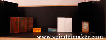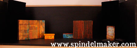 The sandbox, I´ve borrowed from the road construction company. The big wheel we also got for free. The bench is in blues, even though it doesn´t show too well here, and is also an abstract print I made. Below are photos of the model.