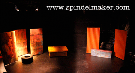 The set, almost all in place. The walls are all 1 x 2meters, and they swing around on a metal rod hidden inside. On one side I´ve used old corrugated iron roof-plates, that were going to be thrown away. On the other side, I´ve printed three abstract pictures onto a textile wallpaper. The remaining two have white backs, to be used as part of the show, that demands a VERY white wall…